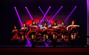 A group of dancers in red dresses perform on stage, with purple lights illuminating the background.