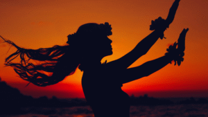 Silhouette of a dancer with flowers in her hair, arms raised against a vibrant sunset over the ocean.