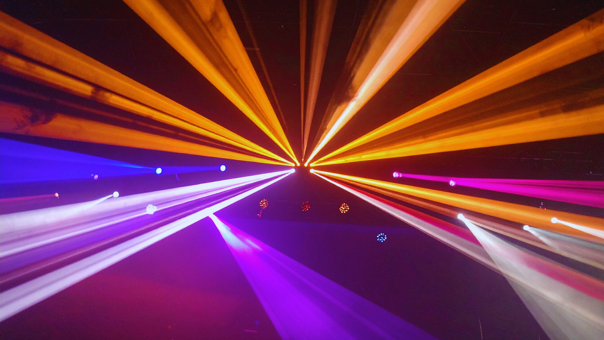 Bright, colorful beams of light in purple, orange, and yellow radiate from a central point against a dark background.
