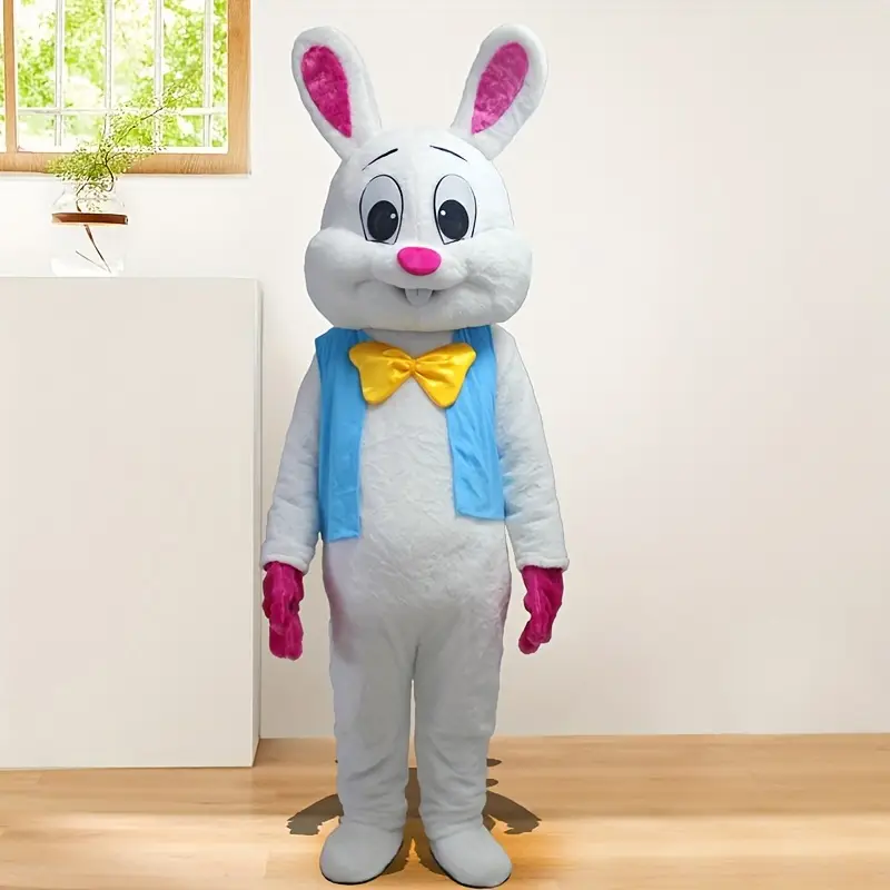 A cartoonish gray bunny costume with pink paws and a yellow bow tie stands in a bright room with wood flooring.