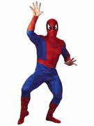 A person dressed as Spider-Man striking a dynamic pose, wearing a red and blue costume with web patterns.